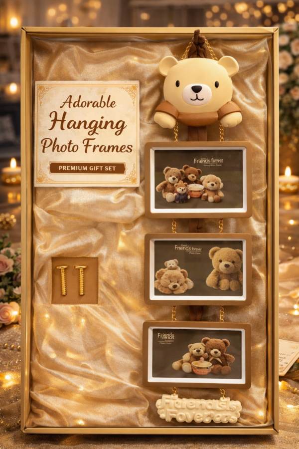 Adorable Teddy Hanging Photo Frame Set అనేది అందమైన జ్ఞాపకాలను ప్రత్యేకంగా ప్రదర్శించడానికి రూపొందించిన ఒక ప్రీమియం గిఫ్ట్ ఐటమ్. ఈ ఫ్రేమ్ సెట్‌లో పైభాగంలో క్యూట్ టెడ్డి బేర్ డిజైన్ ఉంటుంది. టెడ్డి నుండి క్రిందికి చైన్‌ల ద్వారా మూడు ఫోటో ఫ్రేమ్‌లు అందంగా వేలాడుతూ ఉంటాయి. ఇది పిల్లల గది, లివింగ్ రూమ్ లేదా బెడ్‌రూమ్‌కు ఒక మధురమైన అలంకరణగా నిలుస్తుంది.