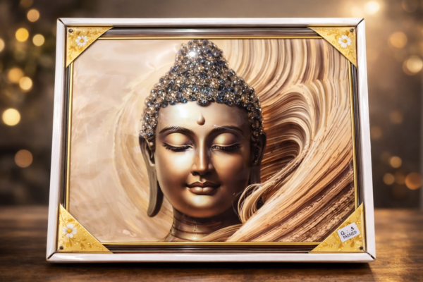 ఈ చిత్రంలో బుద్ధుడు ఒక అద్భుతమైన రూపంలో కనిపిస్తున్నాడు, ఆయన ముఖంపై శాంతి మరియు మౌనం ప్రతిబింబిస్తోంది. బుద్ధుని శరీరంపై ఉన్న మణులు మరియు ప్రకాశవంతమైన ఆభరణాలు ఆయనకు ఇచ్చే ఆధ్యాత్మిక శక్తిని చూపిస్తున్నాయి. ఆయన ముఖంలో ఉన్న చిగుళ్ళు, నిస్సందేహంగా శాంతియుతమైన ఆత్మలను ఆకర్షిస్తున్నాయి.