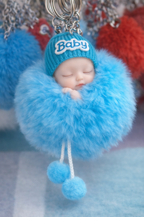 ఈ Cute Baby PomPom Keychain చూడగానే అందరి హృదయాలను కట్టిపడేస్తుంది. మృదువైన బ్లూ ఫ్లఫీ పోంపోం బాల్లో నిద్రలో ఉన్న చిన్న బేబీ ఫేస్ డిజైన్ చాలా క్యూట్గా ఉంటుంది. “Baby” అని ఉన్న నిట్ క్యాప్, చిన్న చేతులు, ముద్దైన ఎక్స్ప్రెషన్ ఈ కీచైన్ను మరింత ఆకర్షణీయంగా మార్చేస్తాయి.