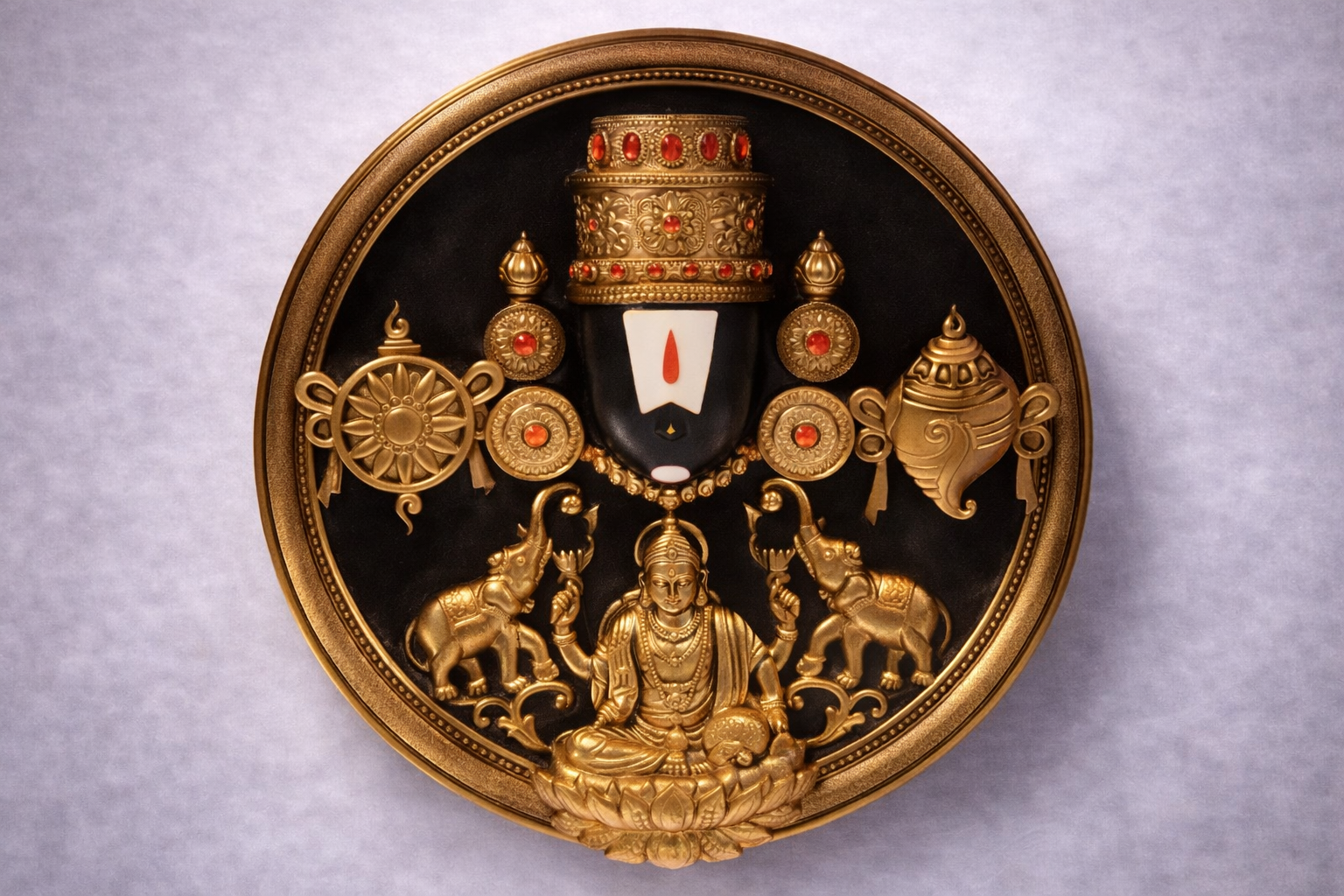 ఈ అద్భుతమైన Divine Balaji Golden Wall Art సంప్రదాయం, భక్తి మరియు కళాత్మకత కలయికగా రూపొందించబడింది. మధ్యలో శ్రీ వేంకటేశ్వర స్వామి వారి దివ్య నామంతో అలంకరించబడిన ఆకృతి, చుట్టూ ఉన్న శంఖం, చక్రం మరియు ఆధ్యాత్మిక చిహ్నాలు ఈ ఆర్ట్కు రాజసమైన అందాన్ని అందిస్తున్నాయి. కింద భాగంలో లక్ష్మీదేవి రూపం మరియు ఏనుగుల అలంకరణలు ఐశ్వర్యం మరియు శుభాన్ని సూచిస్తాయి. గోల్డెన్ ఫినిష్ మరియు సున్నితమైన డీటెయిల్స్ ఈ వాల్ ఆర్ట్ను మరింత ప్రత్యేకంగా నిలబెడతాయి.