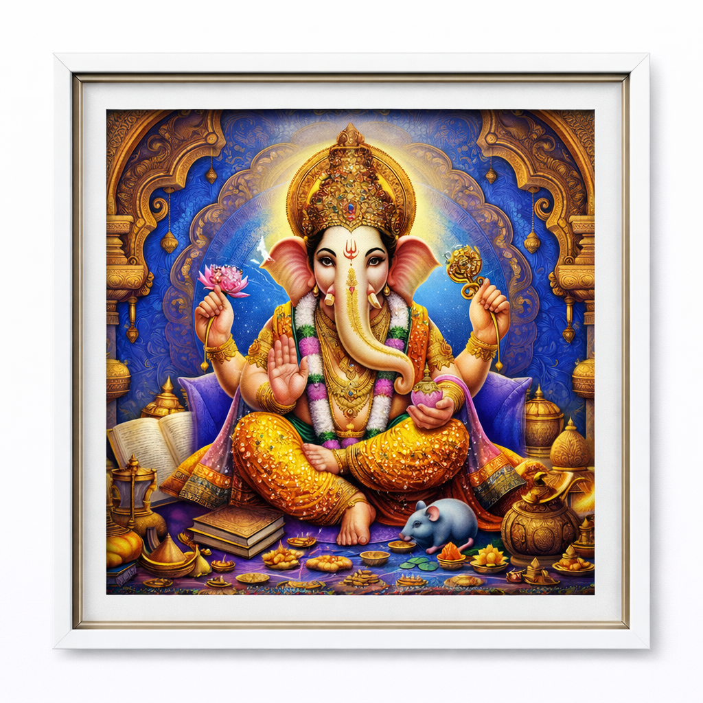 చిత్రంలో ఉన్న బంగారు ఆభరణాలు, అలంకారాలు మరియు రాజసంగా ఉన్న నేపథ్యం ఈ ఫ్రేమ్కు ప్రత్యేకమైన శోభను ఇస్తాయి. నీలం మరియు బంగారు రంగుల కలయిక చిత్రానికి లోతు మరియు ఆధ్యాత్మిక ప్రకాశాన్ని అందిస్తుంది. గణేశుని పాదాల దగ్గర ఉన్న పుస్తకాలు, దీపాలు మరియు నైవేద్యాలు జ్ఞానం, సంపద మరియు శుభప్రదతను సూచిస్తాయి.