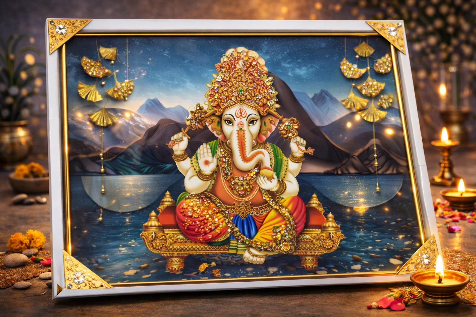 నేపథ్యంలో కనిపించే పర్వతాలు, ప్రశాంతమైన సరస్సు మరియు రాత్రి ఆకాశం ఈ దృశ్యానికి ఒక దివ్యమైన వాతావరణాన్ని కలిగిస్తాయి. గణేశుడి చేతిలో ఉన్న మోదకం, ఆశీర్వాద ముద్ర మరియు పాశం ఆయన శక్తి, జ్ఞానం మరియు రక్షణకు సంకేతాలు. బంగారు అలంకరణలతో కూడిన సింహాసనం చిత్రానికి ప్రత్యేకమైన వైభవాన్ని జోడిస్తుంది.