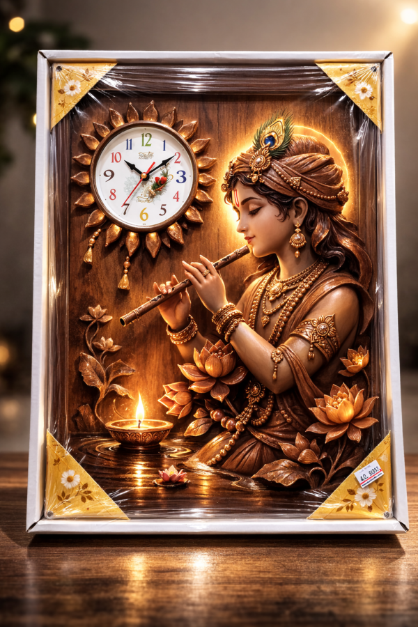 చిత్రం మొత్తం చెక్క శైలి టోన్లో రూపొందించబడింది, ఇది గదికి ఒక సంప్రదాయ మరియు శాంతియుత వాతావరణాన్ని అందిస్తుంది. కృష్ణుడి వెనుక వెలిగే కాంతి వలయం ఆయన దివ్యత్వాన్ని ప్రతిబింబిస్తుంది. పక్కన ఉన్న గోడ గడియారం సూర్యాకార డిజైన్తో తయారు చేయబడి, రంగురంగుల అంకెలతో ఆకర్షణీయంగా కనిపిస్తుంది. ఇది సమయాన్ని స్పష్టంగా చూపించడమే కాకుండా గోడకు ఒక ప్రత్యేక అలంకరణగా నిలుస్తుంది.