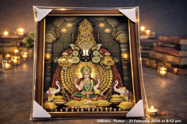 Divine Lakshmi Balaji Premium Frame అనేది ఆధ్యాత్మికత, ఐశ్వర్యం మరియు భక్తిని ప్రతిబింబించే ఒక అద్భుతమైన కళాఖండం. ఈ చిత్రంలో శ్రీ బాలాజీ స్వామి గంభీరమైన దివ్య రూపంలో దర్శనమిస్తారు. ఆయన ముందు శ్రీ లక్ష్మీదేవి పద్మాసనంలో కూర్చొని భక్తులకు కరుణాకటాక్షం ప్రసాదిస్తున్నట్లు చూపబడింది. ఈ సన్నివేశం సంపద, శాంతి మరియు శుభఫలితాలను సూచిస్తుంది.