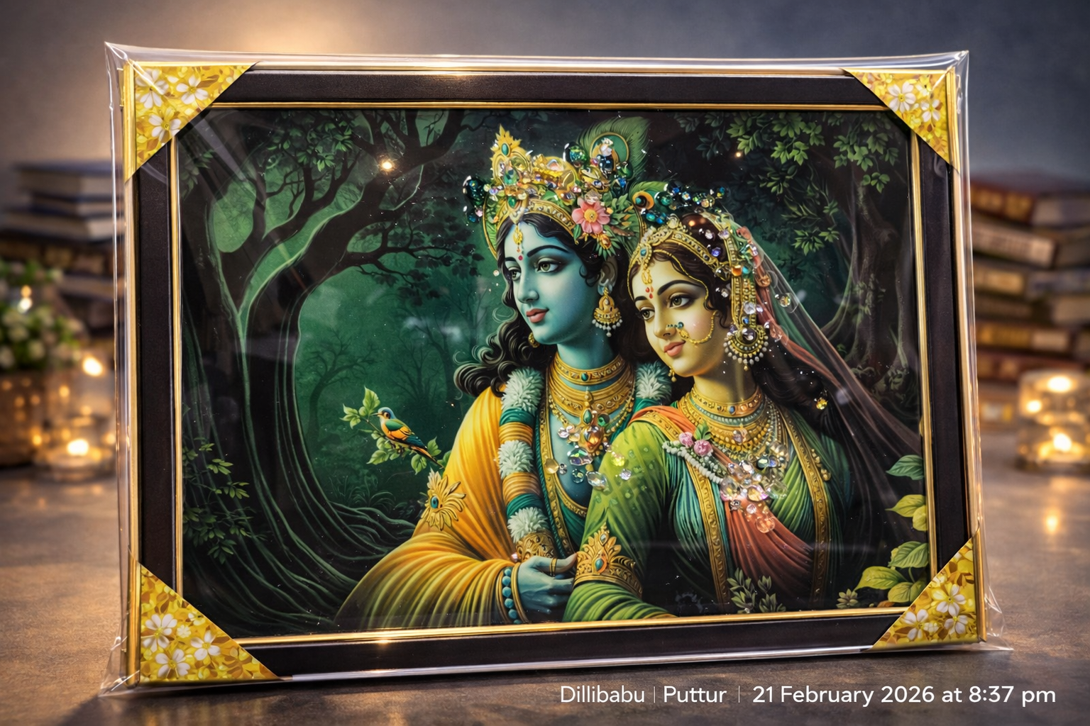 ఈ చిత్రంలో ప్రకృతి పరిమాణంతో, దాని చుట్టూ నాటకం చేసే పక్షులు, పచ్చని చెట్లు, మరియు ప్రాముఖ్యమైన వాతావరణం ప్రేమ మరియు అందం యొక్క ప్రబలాన్ని వ్యక్తపరిచాయి. రాధా మరియు కృష్ణ యొక్క ఈ దివ్య అనుబంధం మానవ సంబంధాలలో గంభీరత మరియు విలువను తెలియజేస్తుంది. కృష్ణుడి ఆనందభరితమైన ముఖం మరియు రాధా యొక్క సున్నితమైన దృష్టి, వారి మధ్య ఉన్న అర్థవంతమైన సంబంధాన్ని పూర్తిగా అందిస్తున్నాయి.