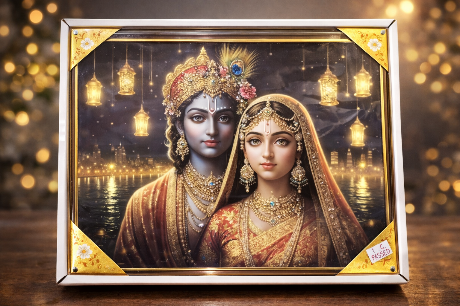 రాత్రి దీపాల వెలుగులో మెరిసే రాధా కృష్ణుల దివ్య ప్రేమ వాల్ ఫ్రేమ్.