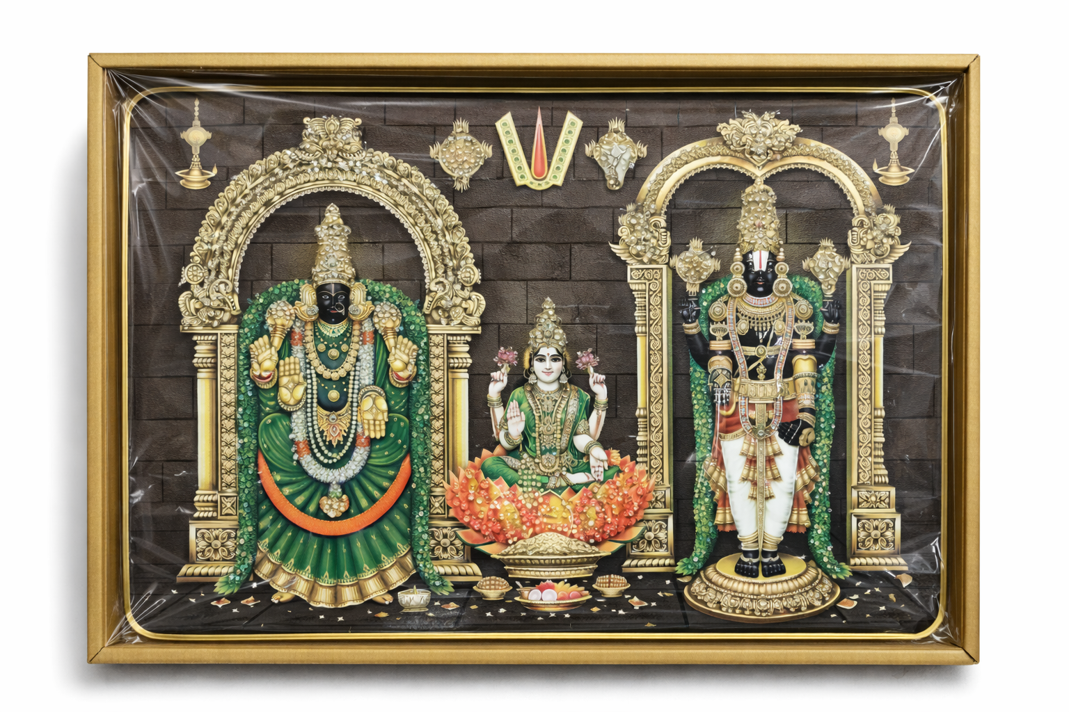 ఈ అద్భుతమైన చిత్రంలో శ్రీ విష్ణు, లక్ష్మి మరియు శివ దేవతలు భక్తుల హృదయాలను స్పూర్తి మరియు శాంతితో నింపే ప్రతీకలుగా ప్రతిబింబించబడ్డారు. వారి ప్రతిష్ట, దైవ శక్తి, మరియు ధర్మ పరిరక్షణలో వారి పాత్ర ప్రతిబింబితమవుతుంది. ఈ చిత్రంలో విష్ణు, తన అనేక ఆభరణాలతో మరియు వృషభంతో ఉన్న శక్తివంతమైన రూపంలో కనిపిస్తారు. ఆయన అనేక ఆభరణాలతో ప్రకాశిస్తారు, వాటి మీద అనేక హోలీలతో తన శక్తిని ప్రదర్శిస్తున్నారు.