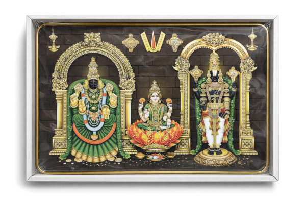 ఈ అద్భుతమైన చిత్రంలో, విష్ణువు, లక్ష్మి మరియు శివ దేవతలు మన జీవితం, ధర్మం మరియు శాంతి కోసం ప్రతీకలు అవుతారు. చిత్రంలో విష్ణువు, అతని పాదాల వద్ద ధనాన్ని ఉంచి, తన శక్తిని మరియు రక్షణను ప్రతిబింబించడంలో కనిపిస్తారు. ఆయన ఉన్నతమైన ఆభరణాలతో అలంకరించబడి, భక్తులకు పరమ శక్తిని అందించే ప్రతీకగా రూపొందాడు.