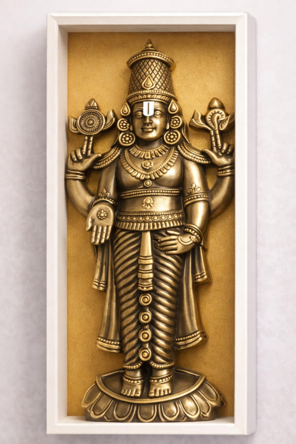 ఈ Divine Vishnu Golden Wall Panel అత్యంత అందంగా మరియు భక్తి భావంతో రూపొందించబడింది. శ్రీ మహావిష్ణువు వారి దివ్య రూపం గోల్డ్ ఫినిష్లో అద్భుతంగా తీర్చిదిద్దబడింది. శంఖం, చక్రం, గద, పద్మం ధరించిన స్వామి వారి శాంత స్వరూపం ఈ వాల్ ప్యానెల్కు పవిత్రతను అందిస్తుంది. గోల్డెన్ బ్యాక్గ్రౌండ్ మరియు వైట్ ఫ్రేమ్ కలయిక దీన్ని మరింత ప్రీమియం మరియు ఎలిగెంట్ లుక్లో చూపిస్తుంది.