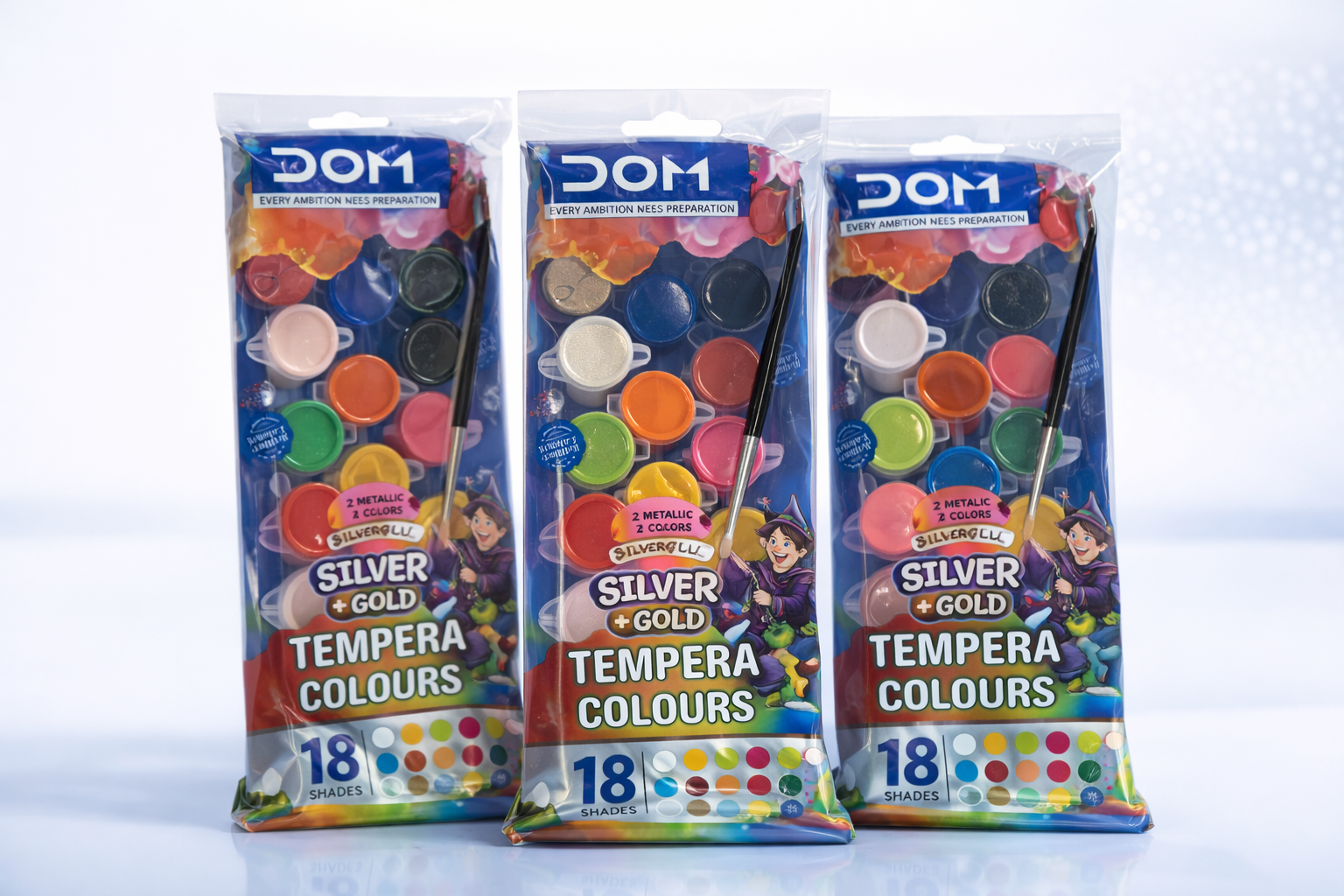 సిల్వర్ & గోల్డ్ మెటాలిక్ షేడ్స్‌తో DOM టెంపెరా కలర్స్ – మొత్తం 18 రంగుల సెట్.