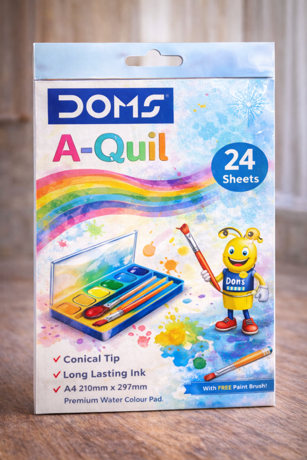 ఈ DOMS A-Quil Water Colour Pad – 24 Sheets ఆర్ట్ ప్రేమికుల కోసం ప్రత్యేకంగా రూపొందించబడిన ప్రీమియం వాటర్ కలర్ ప్యాడ్. A4 సైజ్ (210mm x 297mm) కలిగిన ఈ ప్యాడ్లో 24 హై క్వాలిటీ షీట్స్ ఉంటాయి, ఇవి వాటర్ కలర్స్, పోస్టర్ కలర్స్ మరియు లైట్ అక్రిలిక్ పెయింటింగ్ కోసం అనుకూలంగా ఉంటాయి.