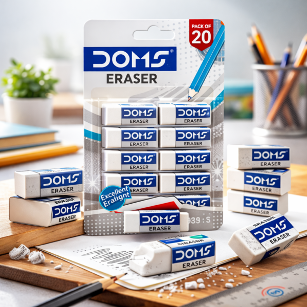 ఈ DOMS Eraser Pack – 20 Pieces స్టూడెంట్స్ మరియు ఆఫీస్ వినియోగానికి సరైన మరియు ఆర్థికమైన ఎంపిక. ఒక్క ప్యాక్లో 20 హై క్వాలిటీ ఇరేసర్లు ఉండటం వల్ల దీర్ఘకాలం ఉపయోగించుకోవచ్చు. పెన్సిల్ రైటింగ్ను స్మూత్గా మరియు పేపర్ను దెబ్బతీయకుండా క్లిన్గా తుడిచేయడానికి వీటి ప్రత్యేక ఫార్ములా సహాయపడుతుంది.