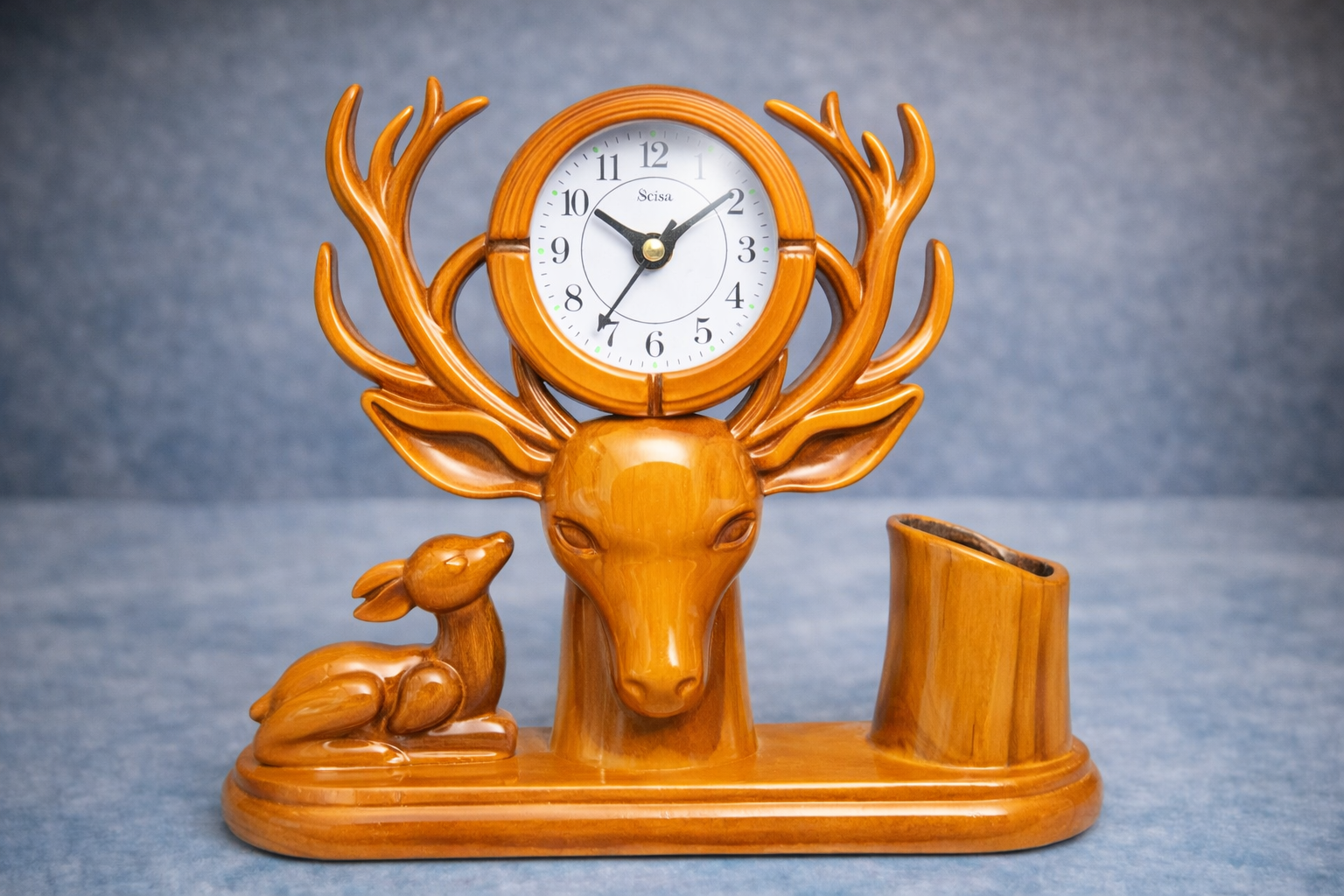 ఈ ప్రత్యేకమైన Elegant Deer Wooden Table Clock with Pen Stand మీ ఇంటికి లేదా ఆఫీస్ డెస్క్కు ఒక క్లాసిక్ మరియు ఆకర్షణీయమైన లుక్ను అందిస్తుంది. జింక (Deer) ఆకారంలో రూపొందించిన ఈ డిజైన్ ఎంతో అందంగా, శిల్పకళను ప్రతిబింబించేలా ఉంటుంది. పై భాగంలో గుండ్రటి క్లాక్ మరియు కింద భాగంలో జింక ముఖం, పక్కన చిన్న జింక ప్రతిమ ఈ ఉత్పత్తికి ప్రత్యేకమైన అందాన్ని జోడిస్తాయి.