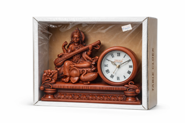 ఈ అందమైన సరస్వతి దేవి టేబుల్ క్లాక్ మీ ఇంటికి ఆధ్యాత్మికతతో పాటు శోభను తీసుకువస్తుంది. శ్రద్ధగా రూపొందించిన ఈ విగ్రహంలో సరస్వతి అమ్మవారు వీణ వాయిస్తున్న భంగిమలో కనిపిస్తారు. విద్య, జ్ఞానం, కళలకు ప్రతీకగా నిలిచే ఈ దేవి విగ్రహం ఇంట్లో ఉంచడం ఎంతో శుభప్రదంగా భావిస్తారు.