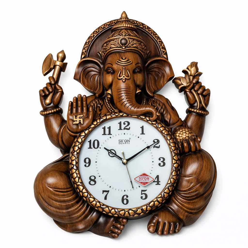 ఈ అందమైన “గణేశ్ వాల్ క్లాక్” భక్తి మరియు ఆధునిక డిజైన్ కలయికగా రూపొందించబడింది. శ్రీ వినాయకుడు పద్మాసనంలో కూర్చొని, ఒక చేతిలో పుష్పం, మరొక చేతిలో పరశు (ఆయుధం) ధరించి, అభయ హస్తంతో ఆశీర్వదిస్తున్న రూపంలో ఎంతో ఆకర్షణీయంగా కనిపిస్తారు. ఇది వుడ్ లుక్ ఫినిష్తో రూపొందించిన ప్లాస్టిక్ మెటీరియల్ కావడం వల్ల తేలికగా ఉండి గోడపై అమర్చుకోవడం సులభం.