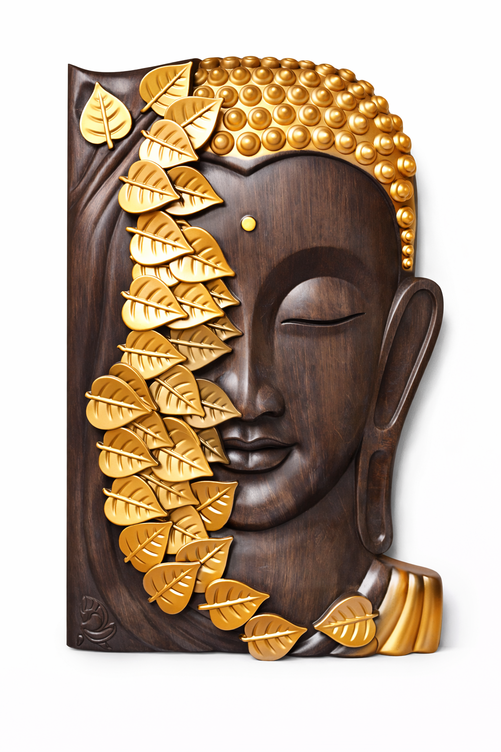 బంగారు బోధి ఆకులు మరియు చెక్కతో రూపొందించిన ఈ బుద్ధ వాల్ ఆర్ట్ ప్రశాంతత, ఆధ్యాత్మికత మరియు శుభాన్ని మీ ఇంటికి తీసుకువస్తుంది. ఇది ఇంటి, కార్యాలయం లేదా ధ్యాన గదికి అద్భుతమైన అలంకరణ.