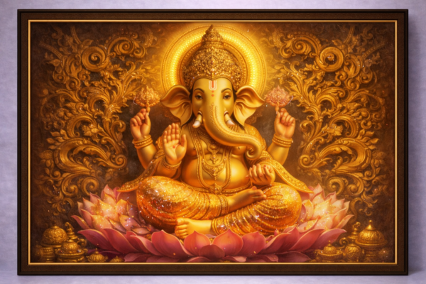 ఈ అద్భుతమైన Golden Ganesha Divine Wall Art భక్తి, శుభం మరియు కళాత్మకత కలయికగా రూపొందించబడింది. పద్మాసనంలో కూర్చున్న శ్రీ గణేశుడి స్వర్ణ రూపం చుట్టూ ఉన్న నాజూకైన అలంకార డిజైన్ ఈ ఫ్రేమ్కు రాజసమైన అందాన్ని ఇస్తుంది. కమలపువ్వుపై వెలిగే గణేశుడు ఇంటికి శాంతి, ఐశ్వర్యం మరియు సానుకూల శక్తిని తీసుకువస్తాడని విశ్వాసం. గోల్డెన్ టోన్, సున్నితమైన డీటైల్స్ మరియు మెరిసే ఫినిష్ ఈ వాల్ ఆర్ట్ను మరింత ప్రత్యేకంగా నిలబెడతాయి.