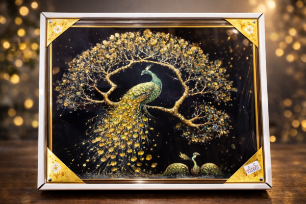 నెమలి భారతీయ సంస్కృతిలో శుభం, సౌందర్యం మరియు గౌరవానికి సూచకం. ఈ చిత్రంలో నల్ల నేపథ్యంపై బంగారు మరియు ఆకుపచ్చ రంగుల కలయిక నెమలి అందాన్ని మరింతగా హైలైట్ చేస్తుంది. చెట్టు కొమ్మలు కూడా బంగారు వెలుగులతో ప్రకాశిస్తూ ఒక స్వప్నసమాన వాతావరణాన్ని సృష్టిస్తాయి. దిగువ భాగంలో కనిపించే చిన్న నెమళ్లు కుటుంబ ఐక్యత మరియు సహజ సౌందర్యాన్ని సూచిస్తాయి.