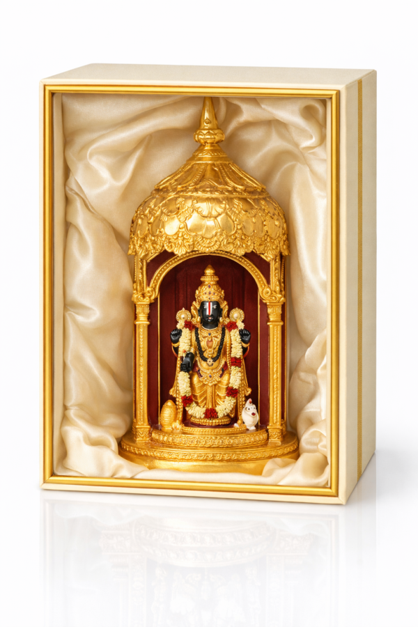 ఈ Golden Temple Balaji Idol ఎంతో వైభవంగా మరియు భక్తి భావంతో రూపొందించబడిన ప్రత్యేకమైన విగ్రహం. అందమైన బంగారు మందిర ఆకారంలో, లోపల శ్రీ బాలాజీ స్వామి విగ్రహం అద్భుతంగా అలంకరించబడింది. స్వామివారి నల్లటి శిల్ప రూపం, బంగారు ఆభరణాలు మరియు పూల హారం దీని ఆధ్యాత్మిక అందాన్ని మరింత పెంచుతున్నాయి. వెనుక భాగంలో ఉన్న రెడ్ బ్యాక్గ్రౌండ్ మరియు చుట్టూ ఉన్న సిల్క్ ఫినిష్ బాక్స్ ఈ విగ్రహానికి ఒక ప్రీమియం మరియు పవిత్రమైన లుక్ ఇస్తాయి.