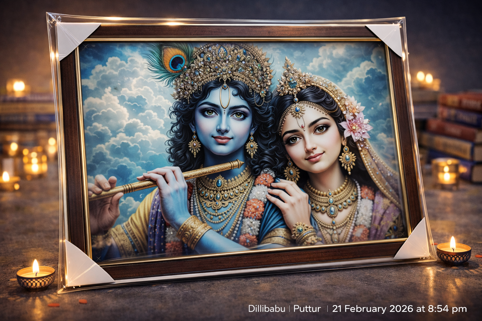 రాధాదేవి సౌందర్యం, ఆమె ధరించిన ఆభరణాలు మరియు పుష్పాల అలంకరణ చిత్రానికి మరింత మృదుత్వాన్ని జోడిస్తాయి. హై క్వాలిటీ ప్రింట్ వల్ల ప్రతి చిన్న డిటైల్ స్పష్టంగా కనిపిస్తుంది. బలమైన చెక్క ఫ్రేమ్ మరియు గోల్డెన్ బోర్డర్ ఈ ఫ్రేమ్కు ప్రీమియం మరియు క్లాసిక్ లుక్ను ఇస్తాయి.