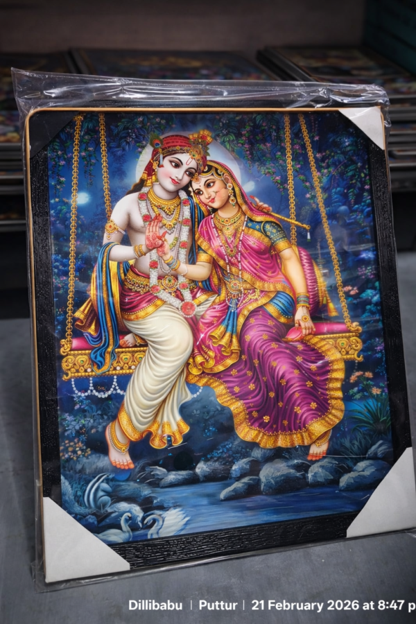 ఈ అద్భుతమైన చిత్రంలో శ్రీ కృష్ణ మరియు రాధా స్వింగులో కలిసిపోవడం ఒకటైన ప్రేమను మరియు ఆనందాన్ని చూపిస్తుంది. ఈ దృశ్యానికి హృదయంగా, ప్రతి దృశ్యం లోని రంగులు, అవగాహన, మరియు సరళత అత్యంత ప్రాముఖ్యత సంతరించుకుంటాయి. వారు ఆనందంగా స్వింగులో కూర్చుని, ఒకరికొకరు ప్రేమగా ముడిపడిన రీతిలో ఉన్నారు.