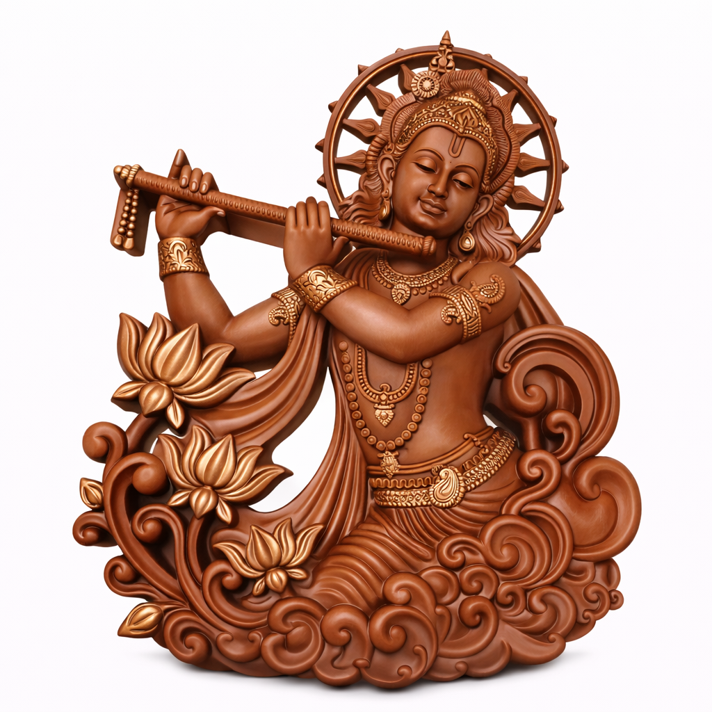 ఈ అందమైన శ్రీకృష్ణుడి వేణువు వాయిస్తున్న విగ్రహం భక్తి, సంగీతం మరియు ఆధ్యాత్మిక ఆనందానికి ప్రతీక. నాజూకైన డిజైన్తో రూపొందించిన ఈ వాల్ డెకర్ విగ్రహంలో శ్రీకృష్ణుడు మృదువైన చిరునవ్వుతో వేణువు వాయిస్తున్న రూపంలో కనిపిస్తారు. చుట్టూ ఉన్న కమల పుష్పాలు మరియు అలంకార ఆకృతులు ఈ విగ్రహానికి మరింత శోభను అందిస్తున్నాయి.