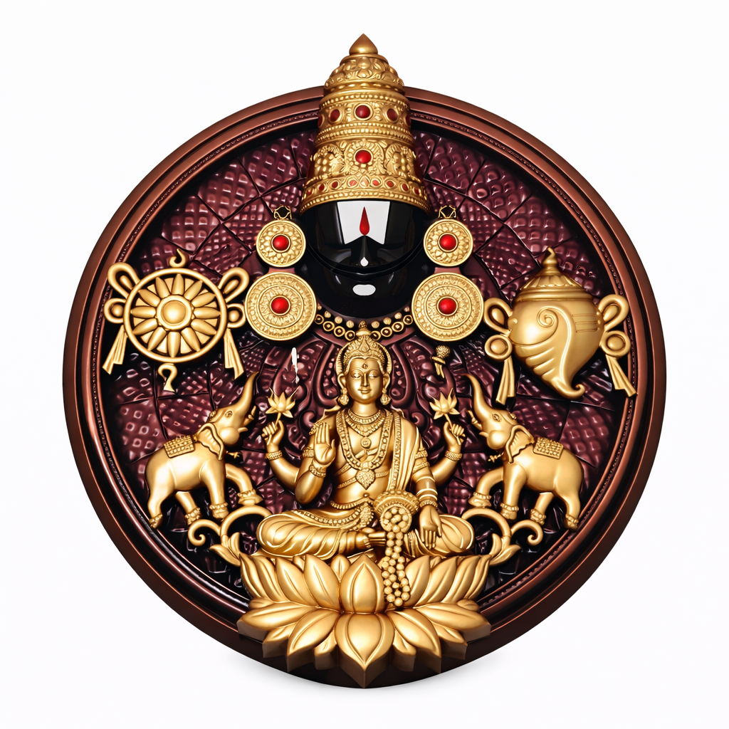 శ్రీ బాలాజీ చుట్టూ శంఖం మరియు చక్రం ప్రతిరూపాలు ఉండటం విశిష్టతను సూచిస్తాయి. క్రింది భాగంలో కమలంపై ఆసీనురాలైన శ్రీ మహాలక్ష్మి దేవి రూపం ఉంటుంది. ఆమె చేతుల్లో కమలాలు మరియు కరుణా ముద్ర ఈ వాల్ డెకర్కు శుభార్థక భావాన్ని ఇస్తాయి. రెండు వైపులా గజాలు ఉండటం గజలక్ష్మి స్వరూపాన్ని ప్రతిబింబిస్తుంది. ఇది సంపద, ఐశ్వర్యం మరియు శుభప్రదతకు సంకేతం.