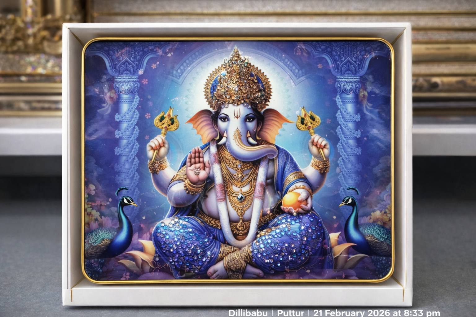 ఈ చిత్రంలో గణేష్ దేవత సొగసైన ఆభూషణాలతో దివ్యమైన రీతిలో ప్రతిబింబింపబడింది. పావతో రంగులు మరియు మణికట్టుతో ఆయన ప్రత్యక్షంగా శాంతి మరియు విజయానికి సూచనగా ఉన్నారు.