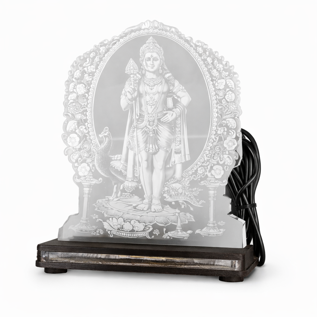 ఈ లార్డ్ మురుగన్ 3D లాంప్ ఒక అద్భుతమైన హోమ్ డెకోర్ వస్తువుగా మరియు ఆధ్యాత్మిక చింతనకు, పూజా గదిలో లేదా ఇతర ప్రదేశాలలో ఉపయోగపడే అనువైన వస్తువుగా తయారుచేయబడింది. ఈ లాంప్లో లార్డ్ మురుగన్ యొక్క 3D రజత ప్రతిమను జ్ఞానం, శక్తి మరియు రక్షణ సూచించే చక్కగా అలంకరించబడింది. ప్రతిమలో మురుగన్ ధ్వజం మరియు మయూరం వంటి పవిత్ర చిహ్నాలు కూడా ఉన్నాయి.