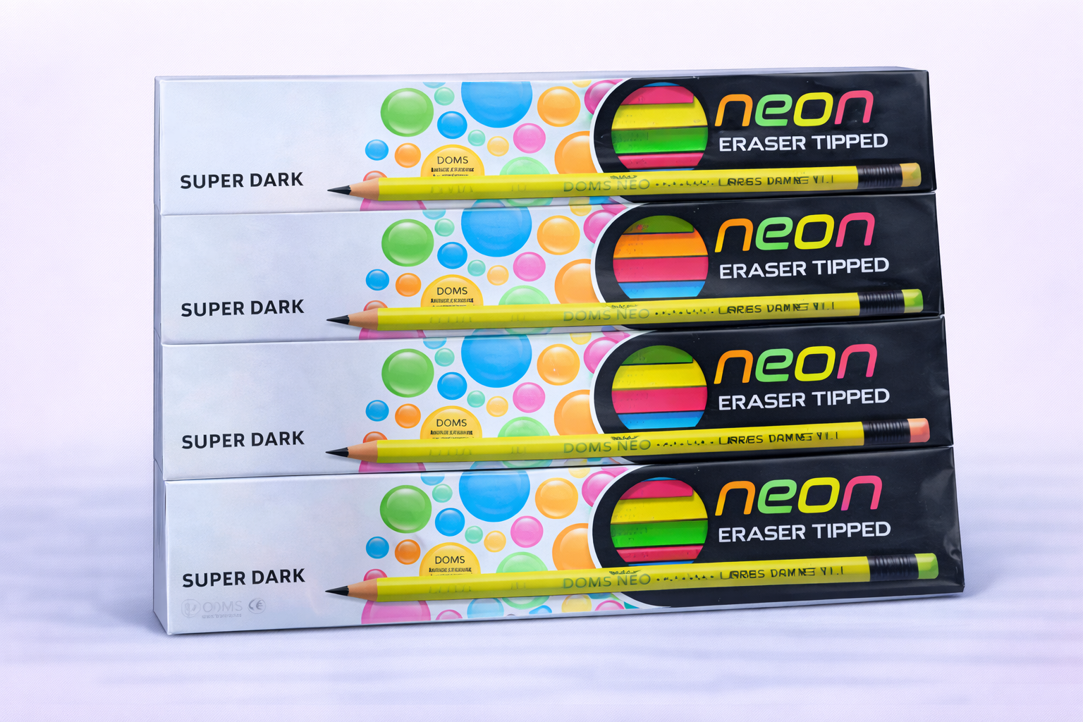 ఈ నియాన్ ఎరేసర్ టిప్పడ్ పెన్సిల్స్ ప్రత్యేకంగా సూపర్ డార్క్ రంగులో అందుబాటులో ఉంటాయి. ఈ పెన్సిల్స్ అందుబాటులో ఉన్న త్రిమితి రంగులతో మీ రచనలకు ప్రత్యేకతను తెస్తాయి. వీటి ఎరేసర్ టిప్ ప్రతీ పెన్సిల్ యొక్క చివరలో ఉంచబడి, రాయడంలో వచ్చే తప్పులను సులభంగా సరిచేయడానికి ఉపయోగపడతాయి.