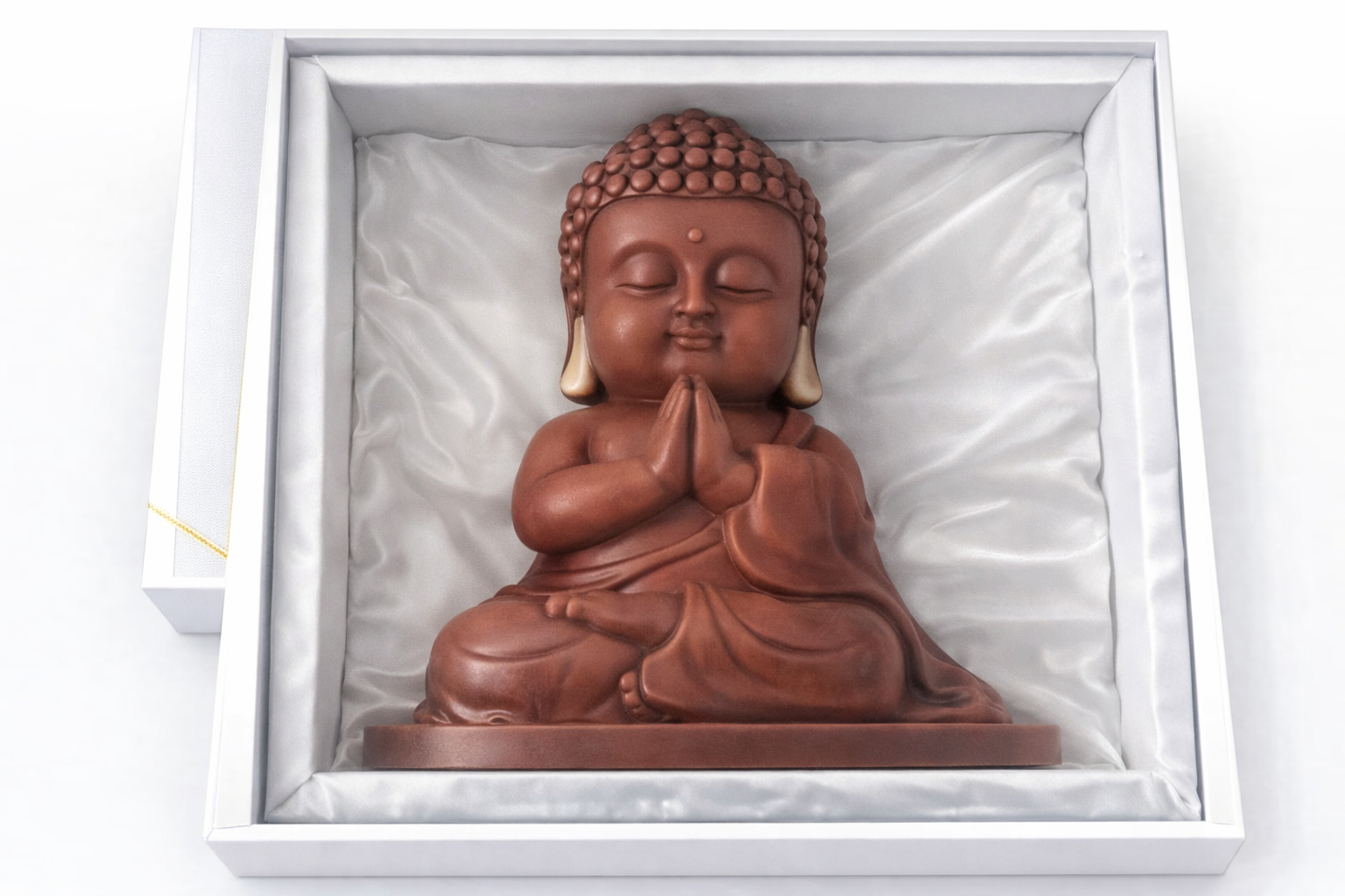 ఈ పీస్ఫుల్ బేబీ బుద్ధ విగ్రహం మీ ఇంటికి ప్రశాంతత మరియు సానుకూల శక్తిని తీసుకువస్తుంది. నమస్కార ముద్రలో కూర్చున్న బుద్ధుని అందమైన రూపం ఎంతో శాంతిమయంగా కనిపిస్తుంది. సింపుల్ కాపర్ ఫినిషింగ్ ఈ విగ్రహానికి రిచ్ మరియు ఎలిగెంట్ లుక్ను ఇస్తుంది.