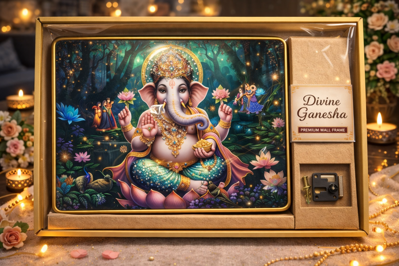 నేపథ్యంలో కనిపించే పచ్చని అరణ్య దృశ్యం, మెరిసే కాంతి తారలు మరియు పుష్పాల అలంకరణ ఈ చిత్రానికి ఒక స్వర్గీయ వాతావరణాన్ని సృష్టిస్తాయి. గణేశుడి ఆభరణాలు, కిరీటం మరియు బంగారు అలంకరణలు చిత్రానికి వైభవాన్ని జోడిస్తాయి. పక్కన అందంగా ప్యాక్ చేయబడిన గిఫ్ట్ బాక్స్ రూపకల్పన దీనిని ప్రీమియం ప్రెజెంటేషన్గా నిలబెడుతుంది.