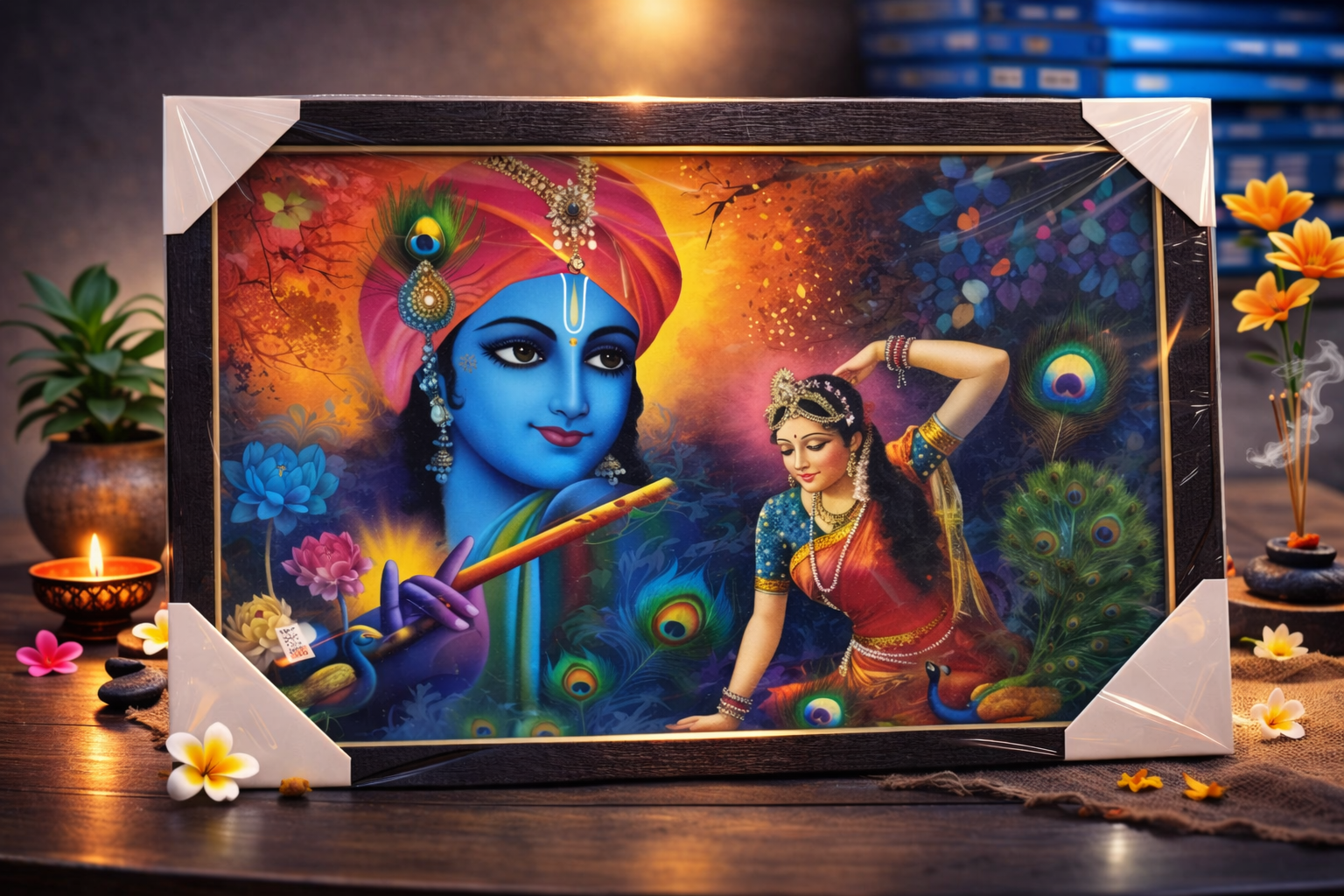 ఈ అద్భుతమైన చిత్రంలో, శ్రీకృష్ణుడు మరియు రాధా మధ్య ప్రేమ మరియు ఆధ్యాత్మిక అనుబంధాన్ని చూడవచ్చు. శ్రీకృష్ణుడు బాణసూరితో అనిపిస్తున్న సంగీతం, దివ్యమైన శాంతిని ప్రతిబింబిస్తూ, ప్రపంచంలో ప్రేమ మరియు ఆనందాన్ని వ్యాప్తి చేస్తున్నాడు. ఆయన ముఖంలో కనిపించే స్వచ్ఛమైన చిగుళ్ళు, అందమైన ఆకారం, మరియు రాధతో కలిసి ఉన్న అనుభూతులు, ఆధ్యాత్మిక సంపూర్ణతను సూచిస్తాయి.