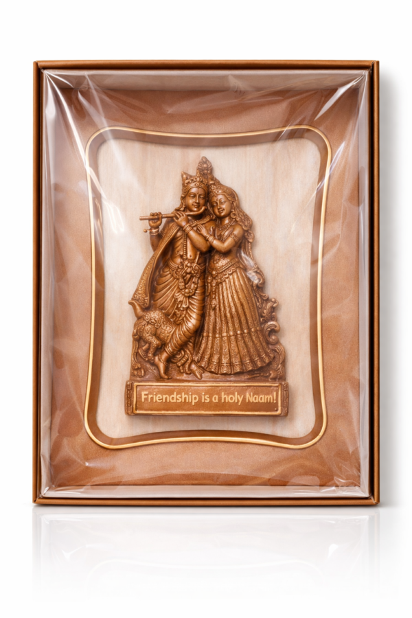 ఈ అందమైన Radha Krishna Friendship Frame రాధా కృష్ణుల పవిత్రమైన ప్రేమ మరియు స్నేహాన్ని అద్భుతంగా ప్రతిబింబిస్తుంది. చెక్కతో రూపొందించిన ఈ కళాఖండంలో కృష్ణుడు వేణువు వాయిస్తూ ఉండగా, రాధా దేవి అతని పక్కన ఆనందంగా నిలబడిన దృశ్యం ఎంతో హృద్యంగా కనిపిస్తుంది. దిగువ భాగంలో ఉన్న “Friendship is a holy Naam!” అనే వాక్యం స్నేహం మరియు దైవ ప్రేమ యొక్క మహత్తును తెలియజేస్తుంది.