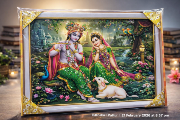Radha Krishna Garden Melody Frame ప్రేమ, భక్తి మరియు ప్రకృతి సౌందర్యం కలయికగా రూపొందించిన అద్భుతమైన ఆధ్యాత్మిక కళాఖండం. ఈ చిత్రంలో శ్రీకృష్ణుడు పచ్చని ఉద్యానవనంలో వేణువు వాయిస్తూ కూర్చొని ఉంటారు. ఆయన పక్కన రాధమ్మ ప్రేమతో ఆయన సంగీతాన్ని ఆస్వాదిస్తూ కనిపిస్తుంది. ఈ దృశ్యం పరమాత్మ మరియు భక్తుని మధ్య ఉన్న పవిత్రమైన అనుబంధాన్ని సూచిస్తుంది.