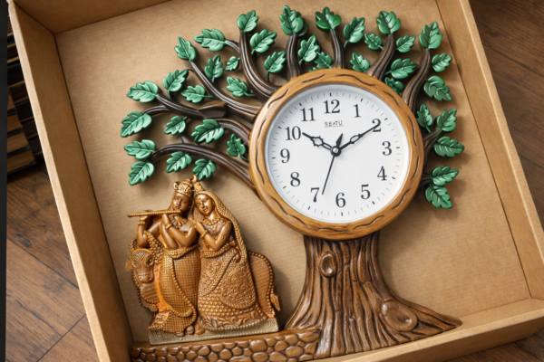 ఈ వాల్ క్లాక్లో ఉన్న గడియారం స్పష్టమైన సంఖ్యలు మరియు సులభంగా చదవగలిగే డయల్తో రూపొందించబడింది, ఇది సమయాన్ని ఖచ్చితంగా చూపిస్తుంది. చెట్టు యొక్క సహజమైన ఆకృతి మరియు ఆకుపచ్చ ఆకులు ప్రకృతి అందాన్ని ప్రతిబింబిస్తూ మీ గోడకు ఒక ప్రత్యేకమైన ఆకర్షణను ఇస్తాయి. రాధా కృష్ణుల విగ్రహం నిపుణంగా రూపొందించబడింది, ఇది కళాత్మకతను మరియు సంప్రదాయ విలువలను ప్రతిబింబిస్తుంది.