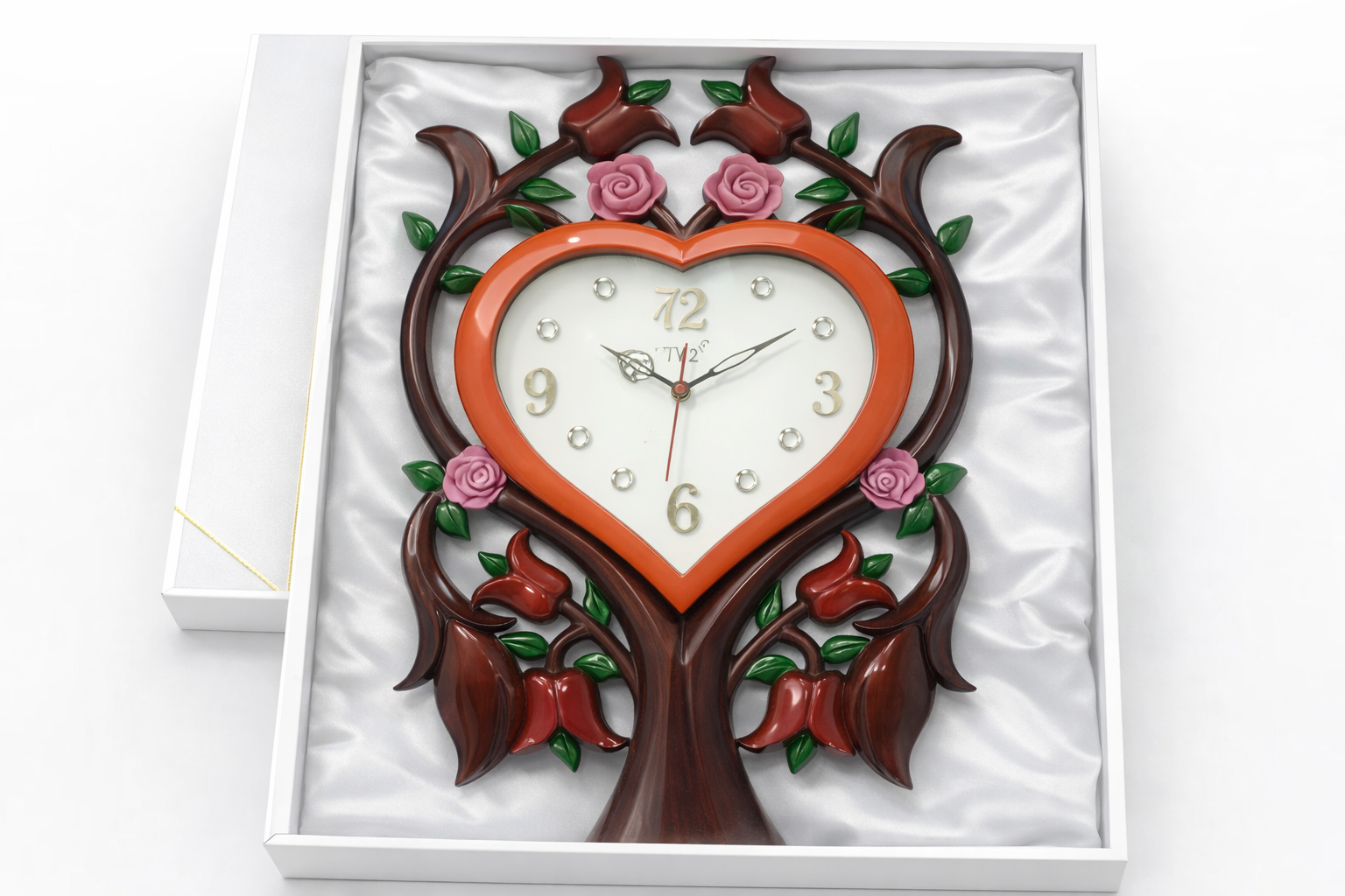 ఈ రొమాంటిక్ హార్ట్ ట్రీ వాల్ క్లాక్ మీ ఇంటికి ప్రేమతో కూడిన అందాన్ని తీసుకువస్తుంది. చెట్టు ఆకారంలో రూపొందించిన డిజైన్ మధ్యలో హార్ట్ షేప్ క్లాక్ ఉండటం ఈ మోడల్కు ప్రత్యేక ఆకర్షణ. పూలు, ఆకులు మరియు బ్రౌన్ ట్రీ ఫినిషింగ్ కలిసిన ఈ డిజైన్ ఎంతో ఆకట్టుకునేలా ఉంటుంది.
