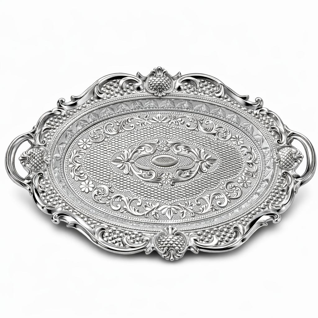 ఈ రాయల్ సిల్వర్ ప్లాస్టిక్ ట్రే మెటల్ లుక్ డిజైన్తో ఆకర్షణీయంగా కనిపించే తేలికైన మరియు ఉపయోగకరమైన సర్వింగ్ ట్రే. ఇది నాణ్యమైన హై-క్వాలిటీ ప్లాస్టిక్తో తయారు చేయబడింది, కాబట్టి బలంగా మరియు దీర్ఘకాలం ఉపయోగించడానికి అనువుగా ఉంటుంది. సిల్వర్ ఫినిష్ మరియు కళాత్మక చెక్కుదిద్దిన డిజైన్ కారణంగా ఇది నిజమైన మెటల్ ట్రేలా కనిపిస్తుంది.