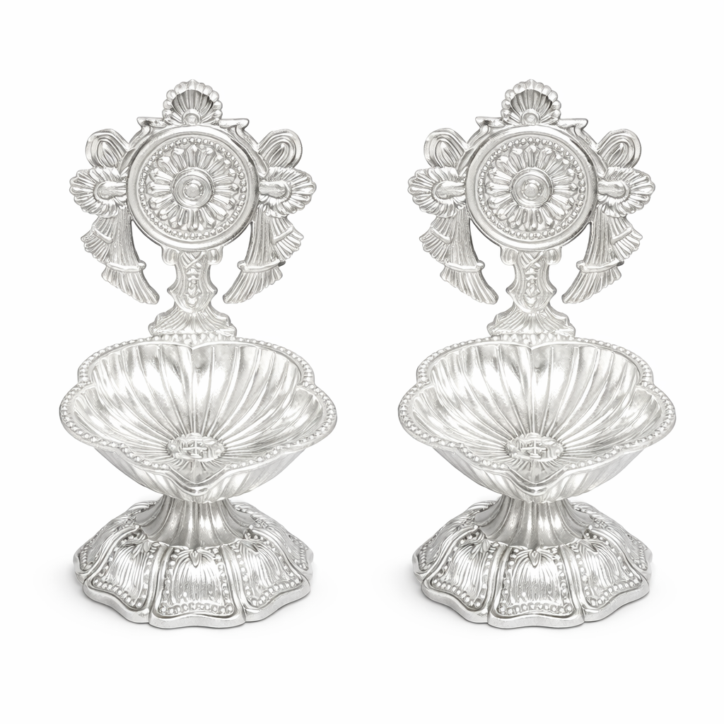 ప్రతి దీపస్తంభం పైభాగంలో అలంకార చక్రాకార డిజైన్ ఉండగా, క్రింద భాగంలో విశాలమైన దీప పాత్ర (దియా బౌల్) ఉంది. ఈ బౌల్లో నూనె లేదా నెయ్యి పోసి వత్తి పెట్టి దీపం వెలిగించవచ్చు. సిల్వర్ ఫినిష్ వల్ల ఇవి క్లాసీ మరియు సంప్రదాయ లుక్ను ఇస్తాయి. క్రింద ఉన్న బేస్ డిజైన్ బలంగా మరియు స్థిరంగా ఉండేలా రూపొందించబడింది, అందువల్ల దీపం వెలిగించినప్పుడు సురక్షితంగా ఉంటుంది.