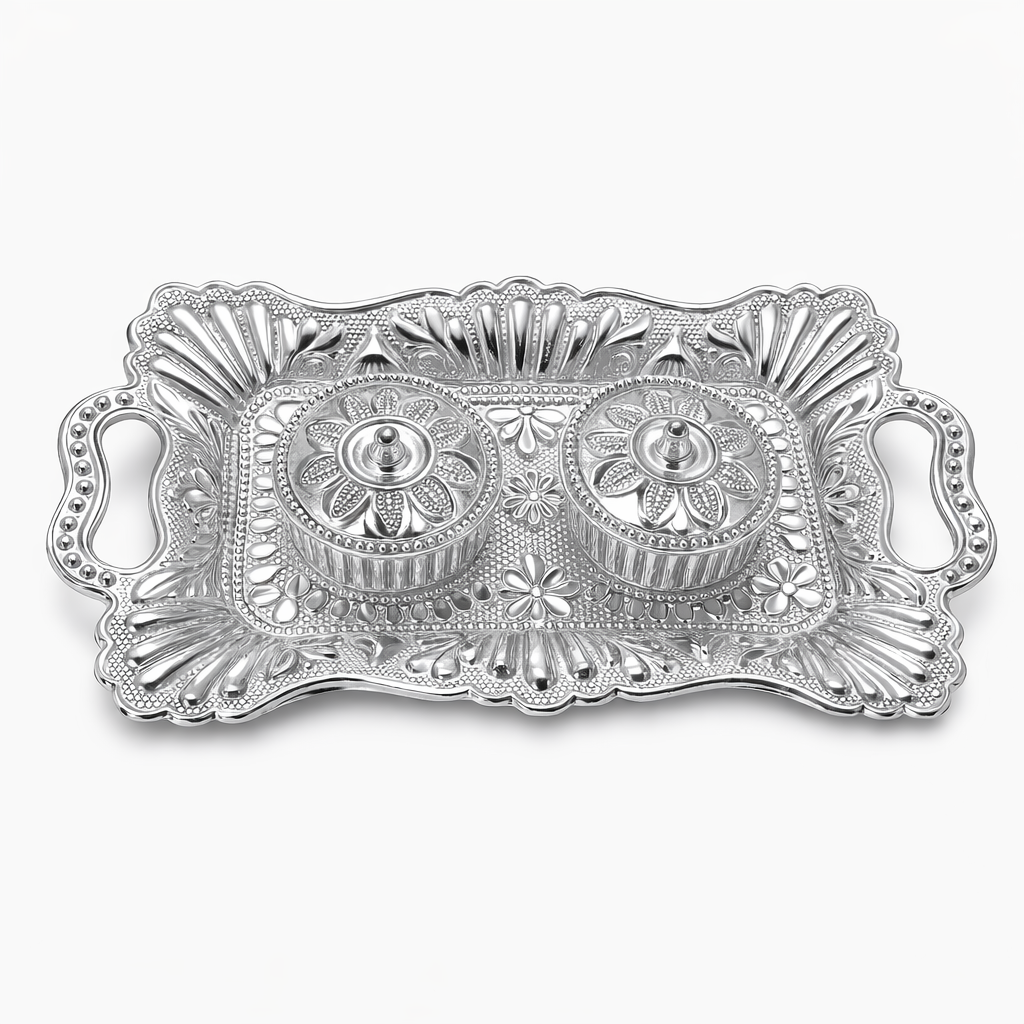 సౌందర్యం, నాణ్యత మరియు ఉపయోగకరత కలిగిన ఈ సిల్వర్ ప్లేటెడ్ సర్వింగ్ సెట్ పూజలు మరియు ప్రత్యేక సందర్భాలకు సరైన ఎంపిక. మీ ఇంటి ప్రతిష్టను పెంచే అందమైన సెట్ ఇది.
