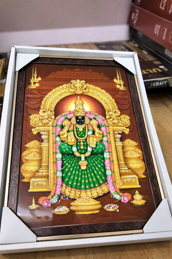 స్వామివారి కిరీటం, నామం మరియు ఆభరణాలు ఎంతో నాజూకుగా డిజైన్ చేయబడ్డాయి. ఆకుపచ్చ రంగు వస్త్రం మరియు పూలమాలలు చిత్రానికి ప్రత్యేకమైన శోభను ఇస్తాయి. స్వామివారి పాదాల వద్ద నైవేద్యాలు మరియు దీపాలు ఉండటం ఈ చిత్రానికి సంపూర్ణమైన ఆధ్యాత్మిక భావాన్ని అందిస్తుంది. బంగారు రంగు ఆధిక్యం ఈ ఫ్రేమ్కు ఒక రాజసమైన మరియు పవిత్రమైన లుక్ ఇస్తుంది.