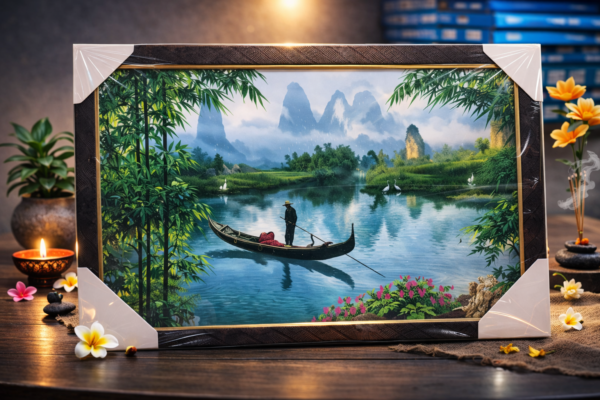 ఈ అద్భుతమైన చిత్రం మనసుకు ప్రశాంతత మరియు ఆత్మశాంతిని అందించే దృశ్యాన్ని చూపిస్తుంది. నది మధ్యలో ఉన్న చిన్న పడవలో ఒక వ్యక్తి, అతని అంగుళాన్ని ఉపయోగించి పడవను నడిపిస్తూ, పచ్చటి చెట్లు మరియు పర్వతాల మధ్య ఉన్న అద్భుతమైన ప్రకృతి అందాలను ఆస్వాదిస్తున్నారు. ఈ చిత్రం లో ఉన్న పచ్చని బాంబూ చెట్లు, దీవి సర్పిళ్లు, మరియు నదిలో ఉన్న ఇత్తడి రంగులు ప్రతీ భాగాన్ని అద్భుతంగా ప్రతిబింబిస్తాయి.