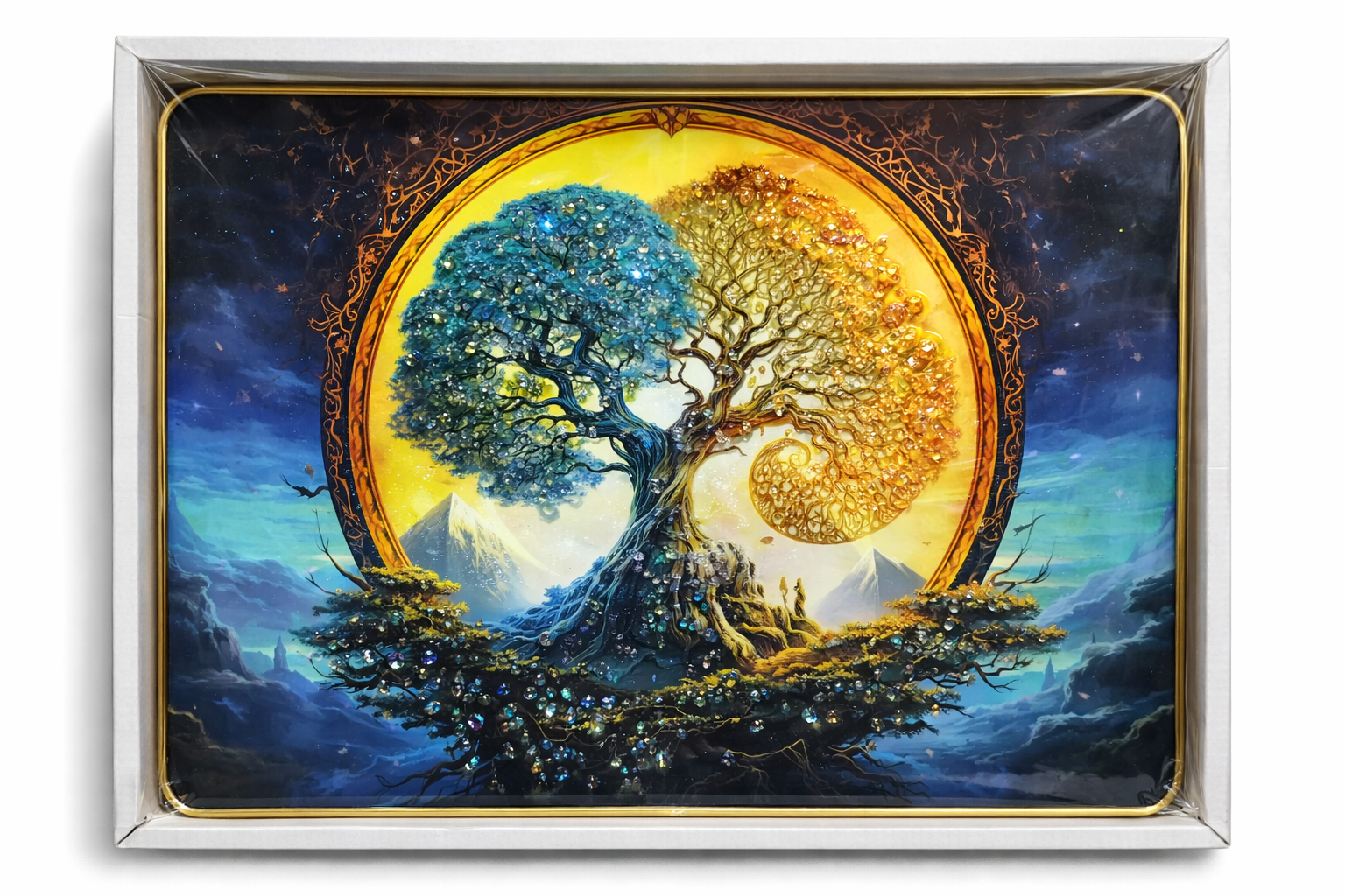 చిత్రంలోని వృక్షం ఒక వైపు నీలం రంగుతో, మరొక వైపు బంగారు కాంతితో అలంకరించబడింది. ఈ ప్రత్యేకమైన డిజైన్ జీవన చక్రాన్ని మరియు ప్రకృతి శక్తిని సూచిస్తుంది. చుట్టూ ఉన్న ప్రకృతి దృశ్యం, పర్వతాలు మరియు ఆకాశం ఈ ఫ్రేమ్‌కు మరింత లోతైన అందాన్ని ఇస్తాయి.