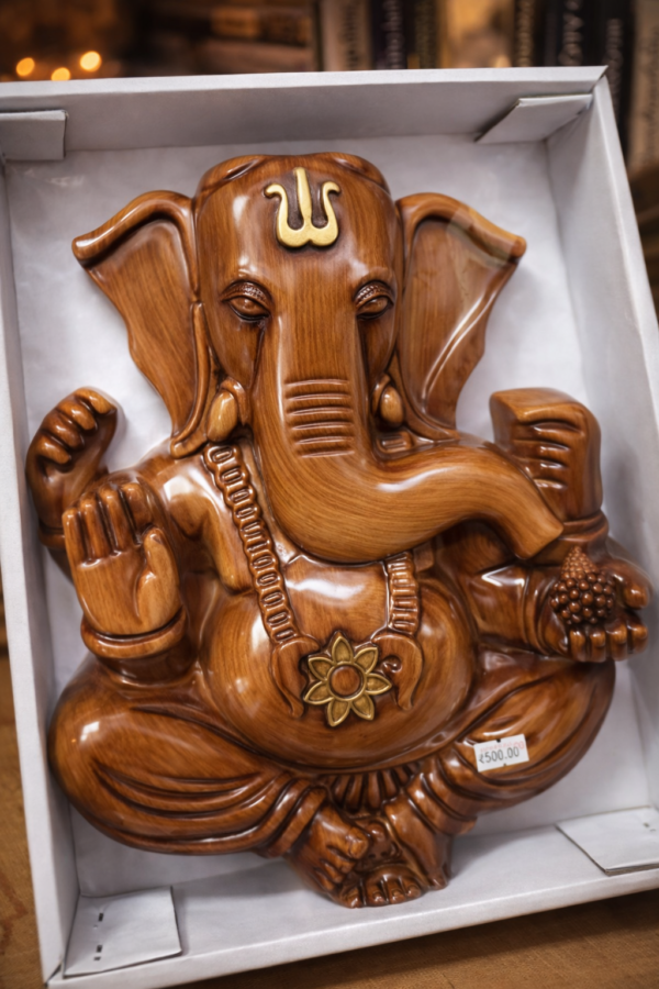 ఈ చిత్రంలో గణేశ్వరుడు చెక్కతో కళాత్మకంగా雕刻 చేయబడిన శిల్పంగా చూపబడుతున్నాడు. ఆయన శరీరం మరియు ముఖం, ప్రతిబింబించే మానవ ఆకృతిలో శాంతి మరియు శక్తిని వృద్ధి చేస్తూ, దేవుడి ఆభూషణాలు, చేతిలో కొబ్బరికాయ, మణి మరియు యవ్వన శక్తిని ప్రతిబింబిస్తున్నాయి. గణేశ్వరుడు, అన్ని ఇబ్బందుల నుండి విముక్తి మరియు విజయాన్ని ఇచ్చే శక్తిగా భావిస్తారు.